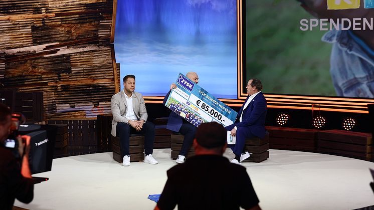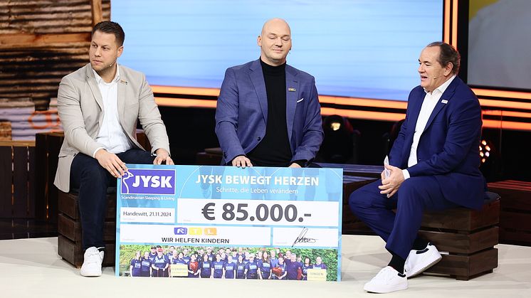 Das Einrichtungsunternehmen JYSK übergibt einen Scheck über 85.000,- Euro beim diesjährigen RTL Spendenmarathon. Die gesammelten Einnahmen aus der „JYSK Charity Run 2024“-Aktion gehen an Organisationen für kranke und benachteiligte Kinder.