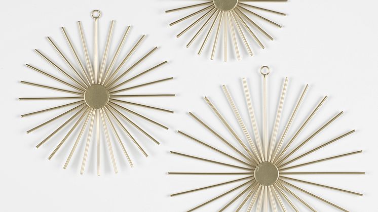 Für einen besonderen Eyecatcher sorgt die Wanddekoration STELLAN. Die drei sonnenförmigen Kreise in Gold können individuell platziert werden und kommen somit super zur Geltung. Die Wanddekoration ist aus Eisen gefertigt und misst im Durchmesser 15 / 20 / 25 cm. (Wanddekoration STELLAN 11,99 Euro)