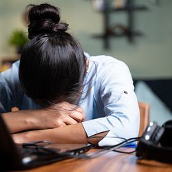 Symbolbild: Ärztin vor Schreibtisch. Geschichte einer 43-jährigen Fachärztin zeigt ihren Kampf aus dem Burnout.