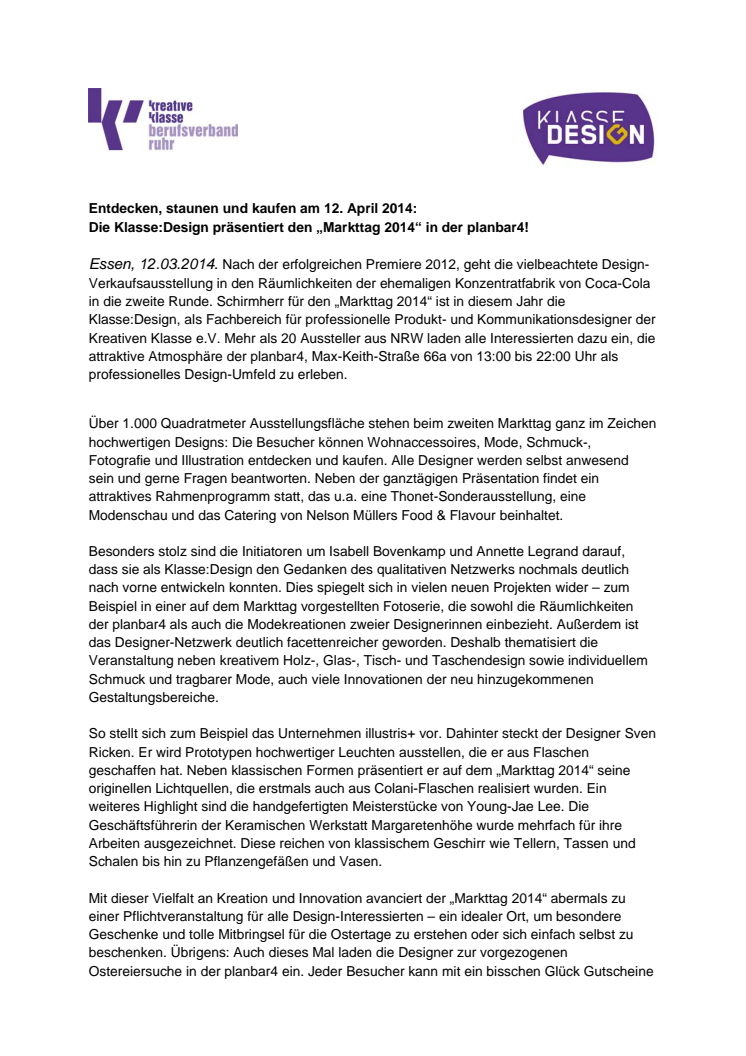 Essen - Nach der erfolgreichen Premiere 2012, geht die vielbeachtete Design-Verkaufsausstellung in den Räumlichkeiten der ehemaligen Konzentratfabrik von Coca-Cola in die zweite Runde. Schirmherr für den „Markttag 2014“ ist in diesem Jahr die Klasse:Design, als Fachbereich für professionelle Produkt- und Kommunikationsdesigner der Kreativen Klasse e.V. Mehr als 20 Aussteller aus NRW laden alle Interessierten dazu ein, die attraktive Atmosphäre der planbar4, Max-Keith-Straße 66a von 13:00 bis 22:00 Uhr als professionelles Design-Umfeld zu erleben.