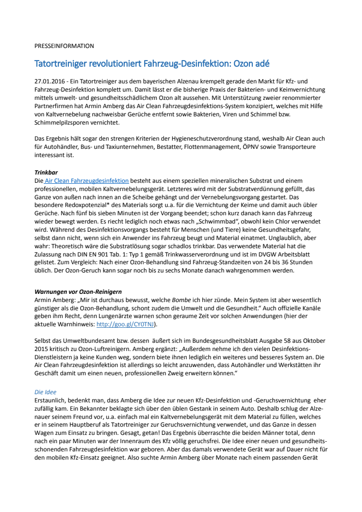 Selbst das Umweltbundesamt bzw. dessen äußert sich im Bundesgesundheitsblatt Ausgabe 58 aus Oktober 2015 kritisch zu Ozon-Luftreinigern. Amberg ergänzt: „Außerdem nehme ich den vielen Desinfektions-Dienstleistern ja keine Kunden weg, sondern biete ihnen lediglich ein weiteres und besseres System an. Die Air Clean Fahrzeugdesinfektion ist allerdings so leicht anzuwenden, dass Autohändler und Werkstätten ihr Geschäft damit um einen neuen, professionellen Zweig erweitern können.“