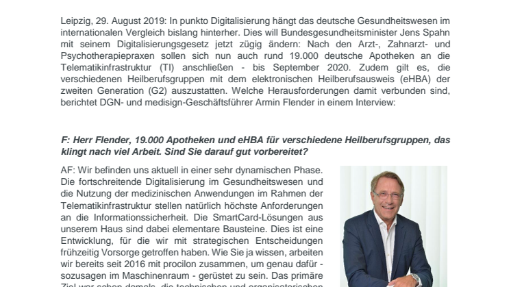 Leipzig, 29. August 2019: In punkto Digitalisierung hängt das deutsche Gesundheitswesen im internationalen Vergleich bislang hinterher. Dies will Bundesgesundheitsminister Jens Spahn mit seinem Digitalisierungsgesetz jetzt zügig ändern: Nach den Arzt-, Zahnarzt- und Psychotherapiepraxen sollen sich nun auch rund 19.000 deutsche Apotheken an die Telematikinfrastruktur (TI) anschließen - bis September 2020. Zudem gilt es, die verschiedenen Heilberufsgruppen mit dem elektronischen Heilberufsausweis (eHBA) der zweiten Generation (G2) auszustatten. Welche Herausforderungen damit verbunden sind, berichtet DGN- und medisign-Geschäftsführer Armin Flender in einem Interview: