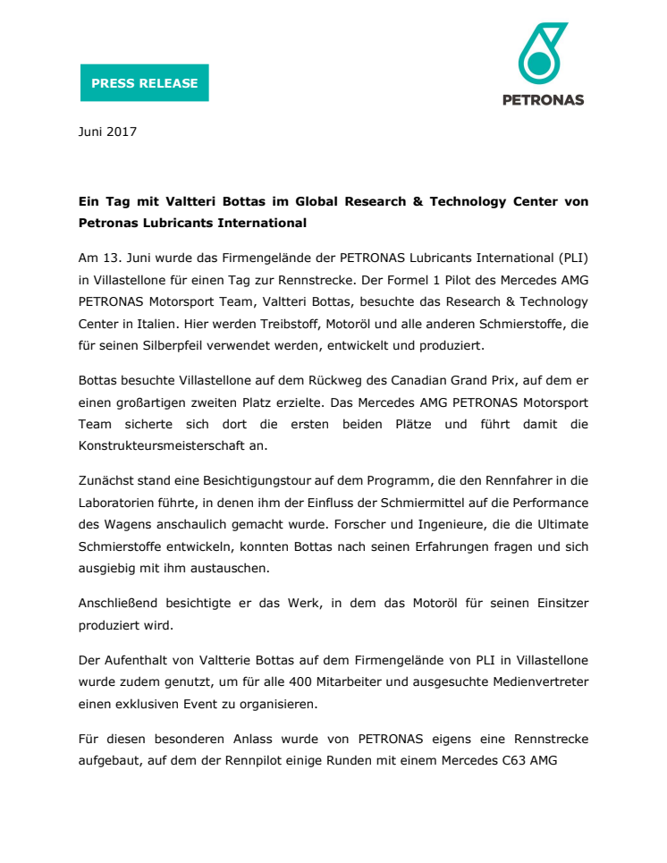 Am 13. Juni wurde das Firmengelände der PETRONAS Lubricants International (PLI) in Villastellone für einen Tag zur Rennstrecke. Der Formel 1 Pilot des Mercedes AMG PETRONAS Motorsport Team, Valtteri Bottas, besuchte das Research & Technology Center in Italien. Hier werden Treibstoff, Motoröl und alle anderen Schmierstoffe, die für seinen Silberpfeil verwendet werden, entwickelt und produziert.