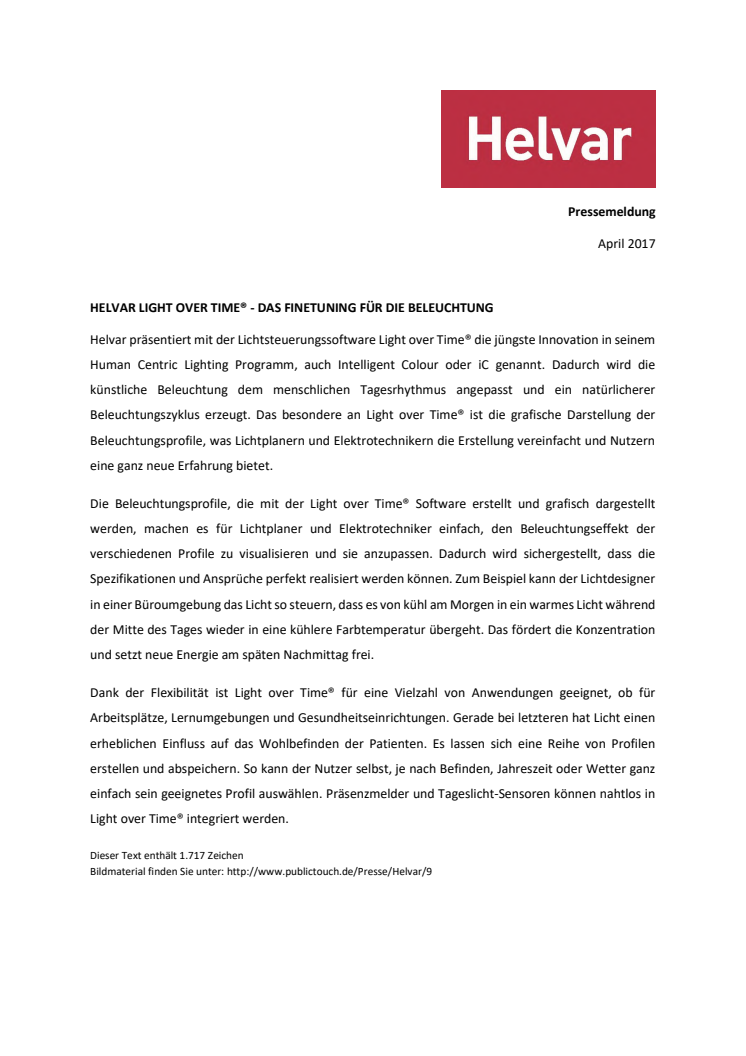 Helvar präsentiert mit der Lichtsteuerungssoftware Light over Time® die jüngste Innovation in seinem Human Centric Lighting Programm, auch Intelligent Colour oder iC genannt. Dadurch wird die künstliche Beleuchtung dem menschlichen Tagesrhythmus angepasst und ein natürlicherer Beleuchtungszyklus erzeugt. Das besondere an Light over Time® ist die grafische Darstellung der Beleuchtungsprofile.