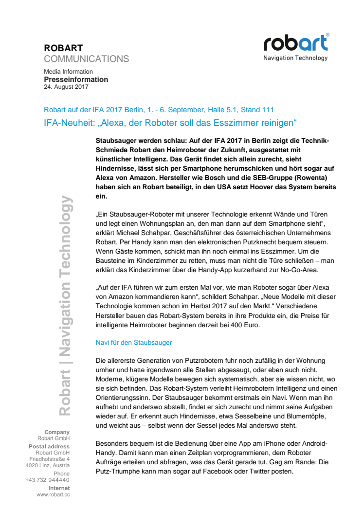 Staubsauger werden schlau: Auf der IFA 2017 zeigt die Robart GmbH den Heimroboter der Zukunft, ausgestattet mit künstlicher Intelligenz. Das Gerät findet sich allein zurecht, sieht Hindernisse, lässt sich per Smartphone herumschicken und hört sogar auf Alexa von Amazon. Hersteller wie Bosch und die SEB-Gruppe (Rowenta) haben sich an Robart beteiligt, in den USA setzt Hoover das System bereits ein.