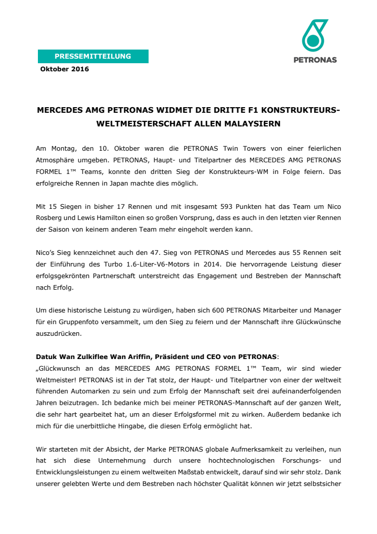 Am Montag, den 10. Oktober waren die PETRONAS Twin Towers von einer feierlichen Atmosphäre umgeben. PETRONAS, Haupt- und Titelpartner des MERCEDES AMG PETRONAS FORMEL 1™ Teams, konnte den dritten Sieg der Konstrukteurs-WM in Folge feiern. Das erfolgreiche Rennen in Japan machte dies möglich.