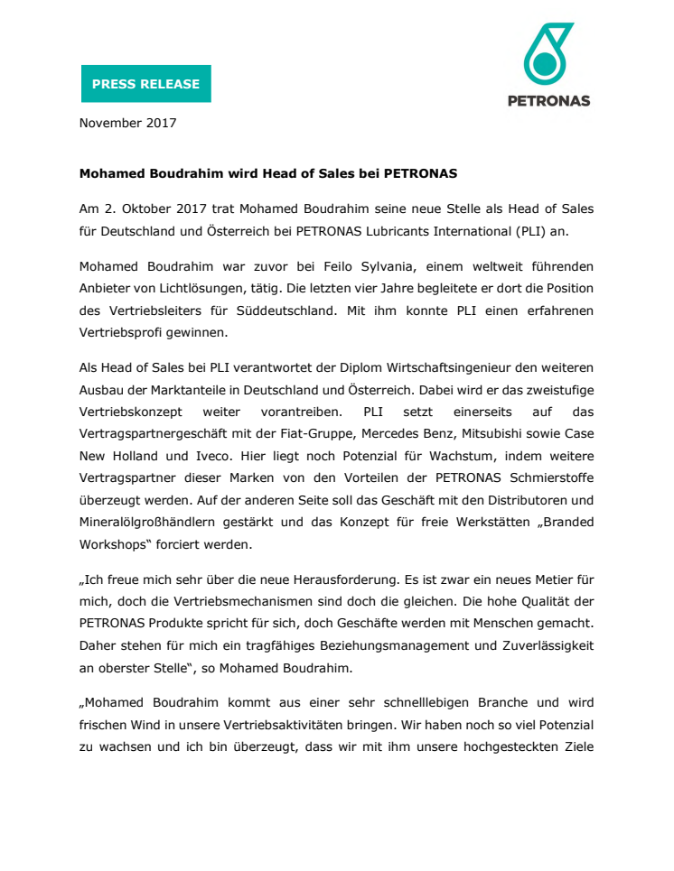 Am 2. Oktober 2017 trat Mohamed Boudrahim seine neue Stelle als Head of Sales für Deutschland und Österreich bei PETRONAS Lubricants International (PLI) an.