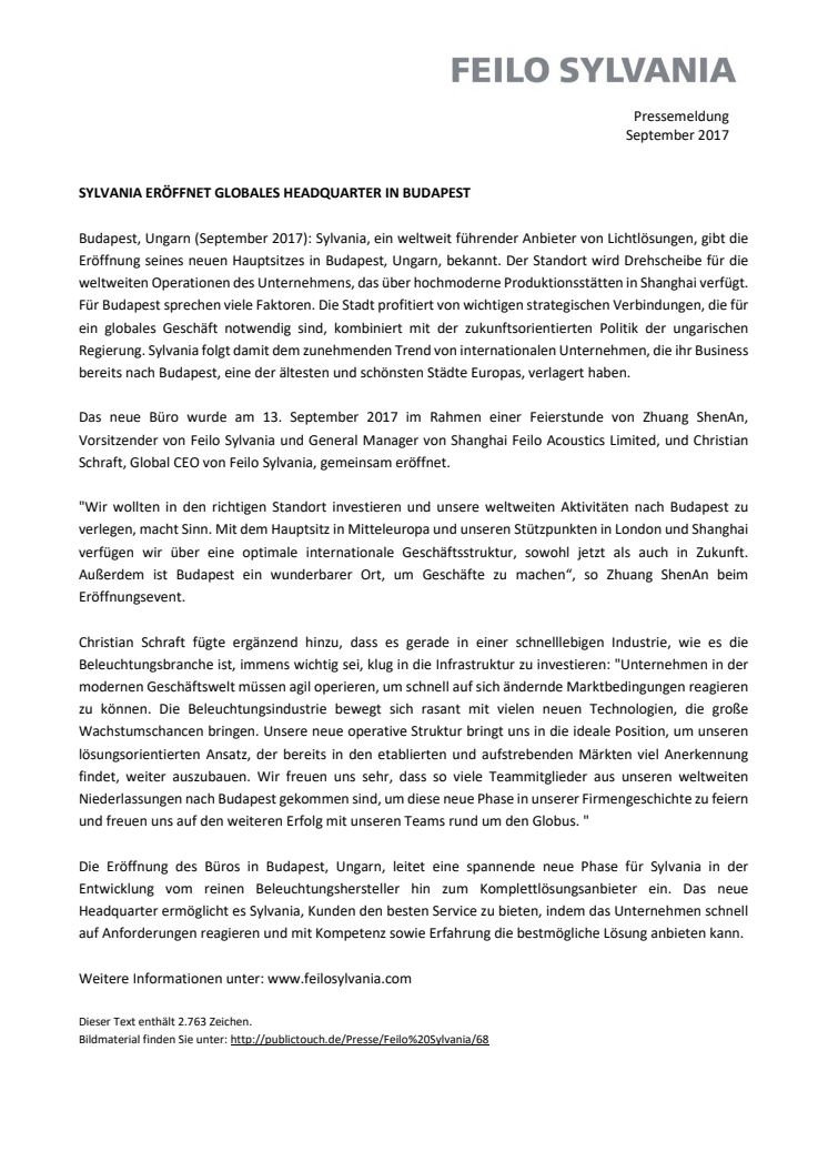 SYLVANIA ERÖFFNET GLOBALES HEADQUARTER IN BUDAPEST