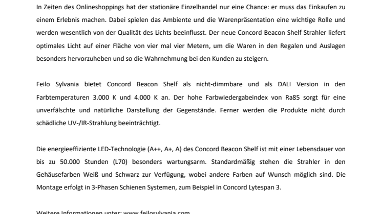 In Zeiten des Onlineshoppings hat der stationäre Einzelhandel nur eine Chance: er muss das Einkaufen zu einem Erlebnis machen. Dabei spielen das Ambiente und die Warenpräsentation eine wichtige Rolle und werden wesentlich von der Qualität des Lichts beeinflusst. Der neue Concord Beacon Shelf Strahler liefert optimales Licht auf einer Fläche von vier mal vier Metern, um die Waren in den Regalen und Auslagen besonders hervorzuheben und so die Wahrnehmung bei den Kunden zu steigern.