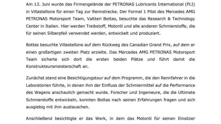 Am 13. Juni wurde das Firmengelände der PETRONAS Lubricants International (PLI) in Villastellone für einen Tag zur Rennstrecke. Der Formel 1 Pilot des Mercedes AMG PETRONAS Motorsport Team, Valtteri Bottas, besuchte das Research & Technology Center in Italien. Hier werden Treibstoff, Motoröl und alle anderen Schmierstoffe, die für seinen Silberpfeil verwendet werden, entwickelt und produziert.