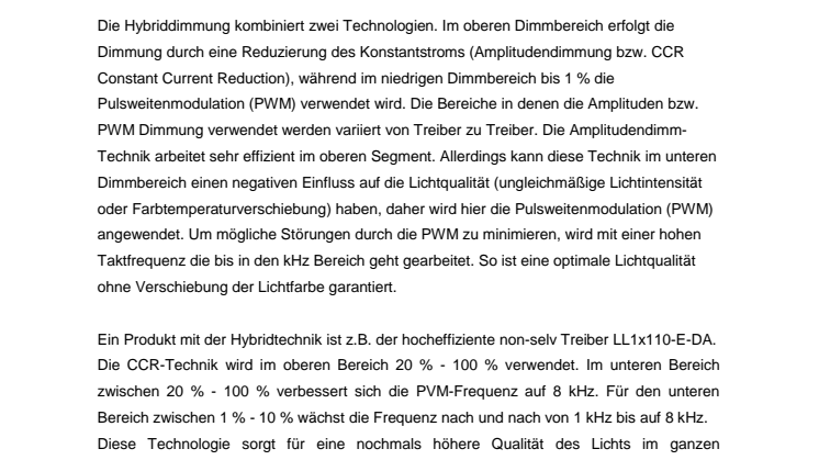 Die Hybriddimmung kombiniert zwei Technologien. Im oberen Dimmbereich erfolgt die Dimmung durch eine Reduzierung des Konstantstroms (Amplitudendimmung bzw. CCR Constant Current Reduction), während im niedrigen Dimmbereich bis 1 % die Pulsweitenmodulation (PWM) verwendet wird. Die Bereiche in denen die Amplituden bzw. PWM Dimmung verwendet werden variiert von Treiber zu Treiber. Die Amplitudendimm-Technik arbeitet sehr effizient im oberen Segment. Allerdings kann diese Technik im unteren Dimmbereich einen negativen Einfluss auf die Lichtqualität (ungleichmäßige Lichtintensität oder Farbtemperaturverschiebung) haben, daher wird hier die Pulsweitenmodulation (PWM) angewendet. Um mögliche Störungen durch die PWM zu minimieren, wird mit einer hohen Taktfrequenz die bis in den kHz Bereich geht gearbeitet. So ist eine optimale Lichtqualität ohne Verschiebung der Lichtfarbe garantiert.