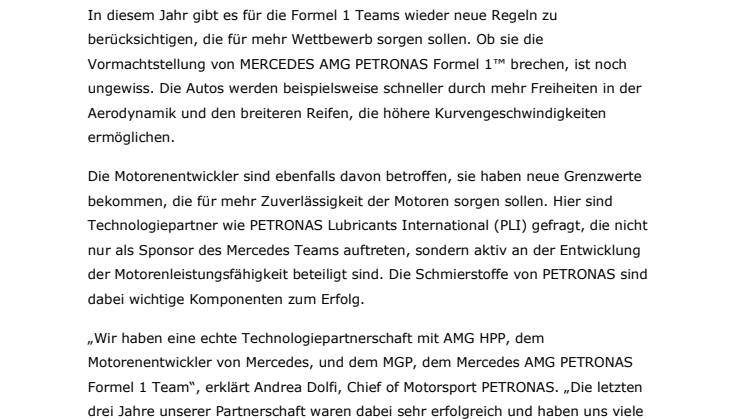Die Motorenentwickler sind ebenfalls davon betroffen, sie haben neue Grenzwerte bekommen, die für mehr Zuverlässigkeit der Motoren sorgen sollen. Hier sind Technologiepartner wie PETRONAS Lubricants International (PLI) gefragt, die nicht nur als Sponsor des Mercedes Teams auftreten, sondern aktiv an der Entwicklung der Motorenleistungsfähigkeit beteiligt sind. Die Schmierstoffe von PETRONAS sind dabei wichtige Komponenten zum Erfolg.