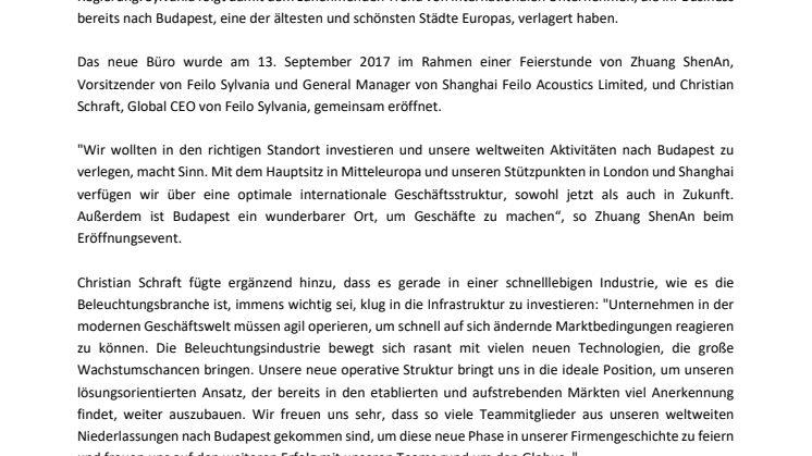 Das neue Büro wurde am 13. September 2017 im Rahmen einer Feierstunde von Zhuang ShenAn, Vorsitzender von Feilo Sylvania und General Manager von Shanghai Feilo Acoustics Limited, und Christian Schraft, Global CEO von Feilo Sylvania, gemeinsam eröffnet.