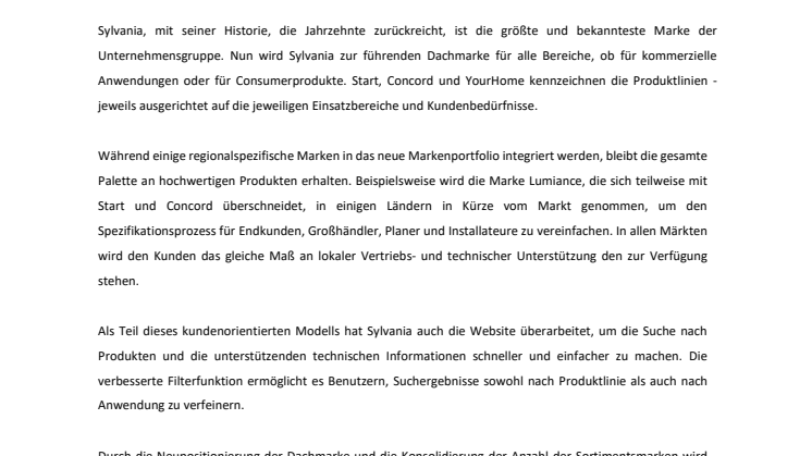 Sylvania, mit seiner Historie, die Jahrzehnte zurückreicht, ist die größte und bekannteste Marke der Unternehmensgruppe. Nun wird Sylvania zur führenden Dachmarke für alle Bereiche, ob für kommerzielle Anwendungen oder für Consumerprodukte. Start, Concord und YourHome kennzeichnen die Produktlinien - jeweils ausgerichtet auf die jeweiligen Einsatzbereiche und Kundenbedürfnisse.
