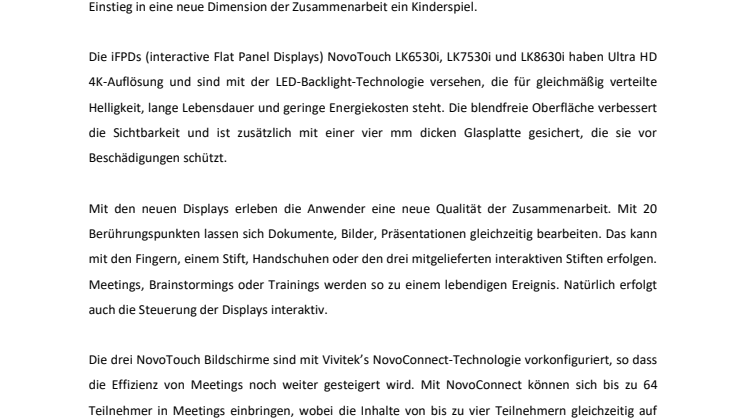 Vivitek, führender Anbieter audiovisueller Präsentationslösungen, bietet mit der NovoTouch Serie interaktive Flachbildschirme mit NovoConnect, dem drahtlosen Präsentationssystem. Damit ist der Einstieg in eine neue Dimension der Zusammenarbeit ein Kinderspiel.
