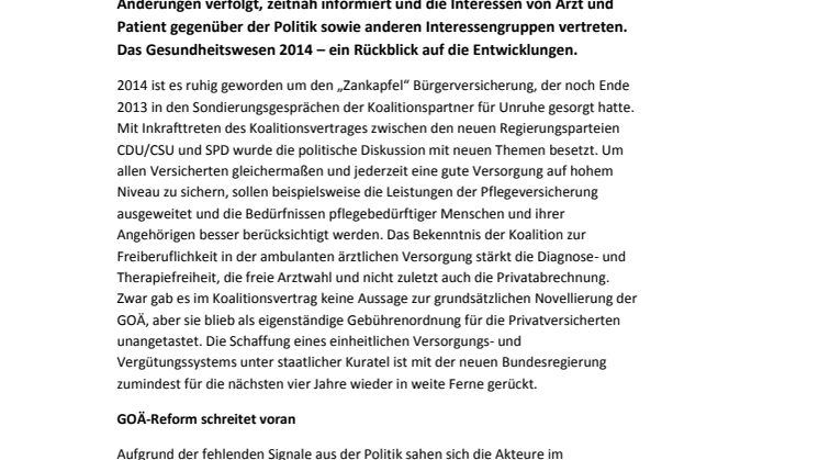 2014 ist es ruhig geworden um den „Zankapfel“ Bürgerversicherung, der noch Ende 2013 in den Sondierungsgesprächen der Koalitionspartner für Unruhe gesorgt hatte. Mit Inkrafttreten des Koalitionsvertrages zwischen den neuen Regierungsparteien CDU/CSU und SPD wurde die politische Diskussion mit neuen Themen besetzt. Um allen Versicherten gleichermaßen und jederzeit eine gute Versorgung auf hohem Niveau zu sichern, sollen beispielsweise die Leistungen der Pflegeversicherung ausgeweitet und die Bedürfnissen pflegebedürftiger Menschen und ihrer Angehörigen besser berücksichtigt werden. Das Bekenntnis der Koalition zur Freiberuflichkeit in der ambulanten ärztlichen Versorgung stärkt die Diagnose- und Therapiefreiheit, die freie Arztwahl und nicht zuletzt auch die Privatabrechnung. Zwar gab es im Koalitionsvertrag keine Aussage zur grundsätzlichen Novellierung der GOÄ, aber sie blieb als eigenständige Gebührenordnung für die Privatversicherten unangetastet. Die Schaffung eines einheitlichen Versorgungs- und Vergütungssystems unter staatlicher Kuratel ist mit der neuen Bundesregierung zumindest für die nächsten vier Jahre wieder in weite Ferne gerückt.