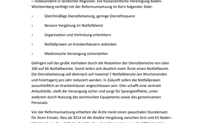 Zum 1. Januar 2014 ist die Reform des ärztlichen Notfalldienstes in Baden-Württemberg in Kraft getreten. Gründe für einen Reformbedarf waren in erster Linie die chronische Unterfinanzierung sowie die ungleichmäßige Dienstfrequenz der Ärzte – insbesondere in ländlichen Regionen. Die Kassenärztliche Vereinigung Baden-Württemberg verfolgt mit der Reformumsetzung im Kern folgender Ziele:
