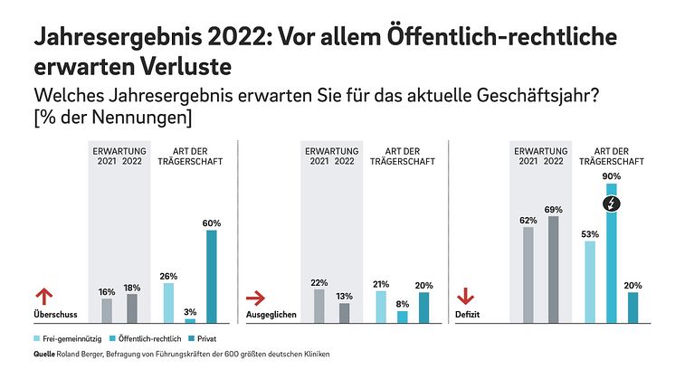 München, September 2022: Die wirtschaftliche Situation der deutschen Krankenhäuser hat sich in diesem Jahr und insbesondere in den vergangenen Monaten weiter zugespitzt. Stagnierende stationäre Fallzahlen, der Wegfall der COVID-19-Ausgleichszahlungen und Erlösausfälle durch Personalmangel sorgen für wachsende Defizite. So werden voraussichtlich neun von zehn Kliniken in öffentlich-rechtlicher Trägerschaft in diesem Jahr Verluste schreiben, über alle Trägerformen hinweg sind es wohl knapp 70 Prozent. Das sind die wichtigsten Ergebnisse der „Krankenhausstudie 2022“ von Roland Berger.