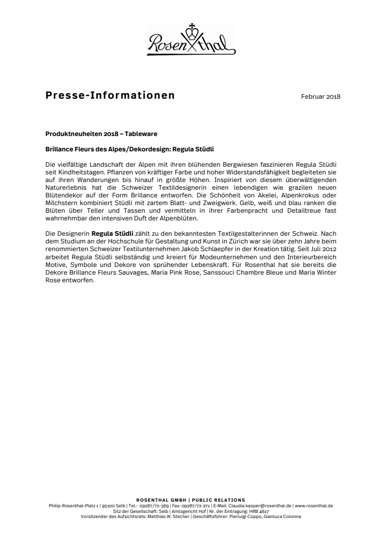 Die Designerin Regula Stüdli zählt zu den bekanntesten Textilgestalterinnen der Schweiz. Nach dem Studium an der Hochschule für Gestaltung und Kunst in Zürich war sie über zehn Jahre beim renommierten Schweizer Textilunternehmen Jakob Schlaepfer in der Kreation tätig. Seit Juli 2012 arbeitet Regula Stüdli selbständig und kreiert für Modeunternehmen und den Interieurbereich Motive, Symbole und Dekore von sprühender Lebenskraft. Für Rosenthal hat sie bereits die Dekore Brillance Fleurs Sauvages, Maria Pink Rose, Sanssouci Chambre Bleue und Maria Winter Rose entworfen.