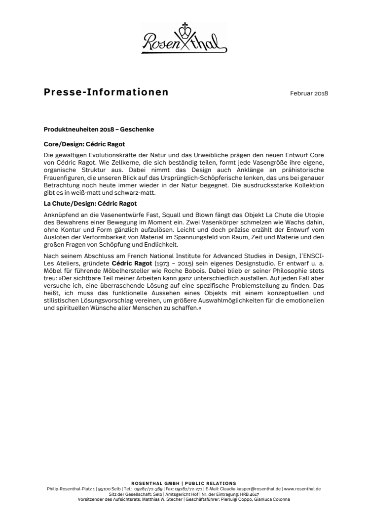 Die gewaltigen Evolutionskräfte der Natur und das Urweibliche prägen den neuen Entwurf Core von Cédric Ragot. Wie Zellkerne, die sich beständig teilen, formt jede Vasengröße ihre eigene, organische Struktur aus. Dabei nimmt das Design auch Anklänge an prähistorische Frauenfiguren, die unseren Blick auf das Ursprünglich-Schöpferische lenken, das uns bei genauer Betrachtung noch heute immer wieder in der Natur begegnet. Die ausdrucksstarke Kollektion gibt es in weiß-matt und schwarz-matt.