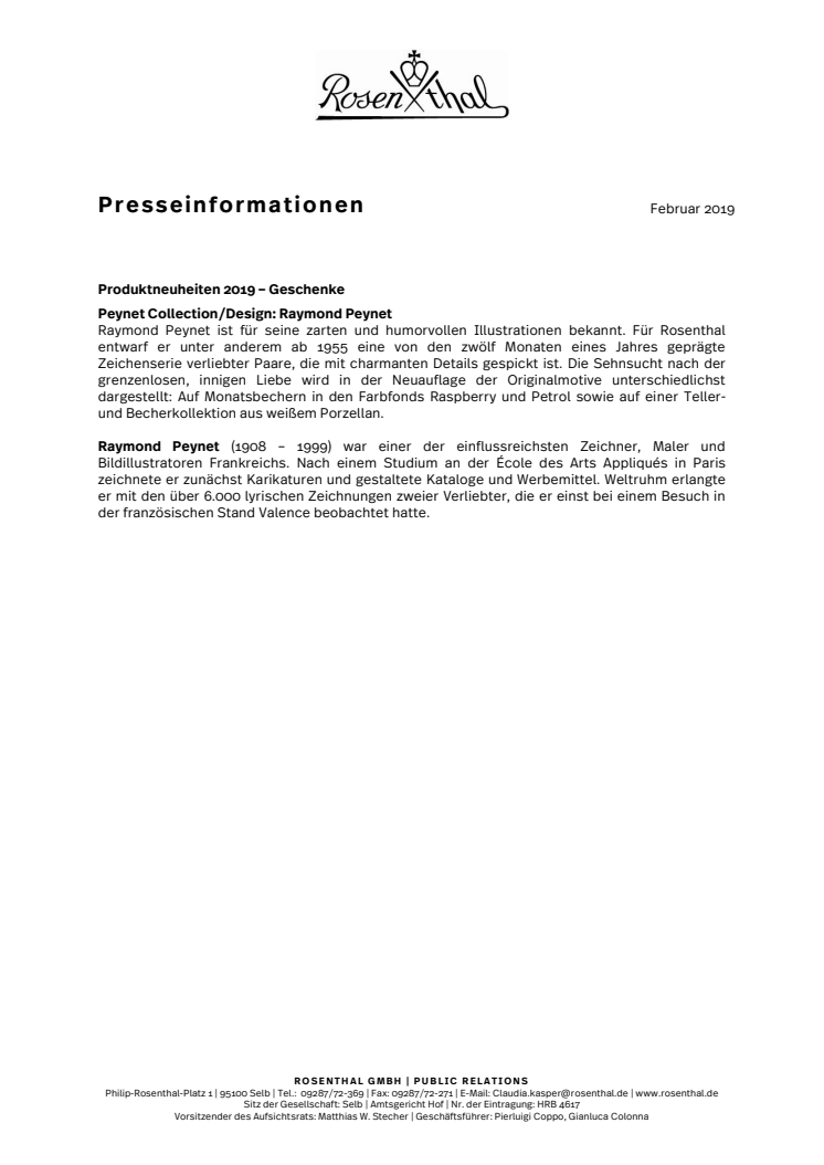 Raymond Peynet ist für seine zarten und humorvollen Illustrationen bekannt. Für Rosenthal entwarf er unter anderem ab 1955 eine von den zwölf Monaten eines Jahres geprägte Zeichenserie verliebter Paare, die mit charmanten Details gespickt ist. Die Sehnsucht nach der grenzenlosen, innigen Liebe wird in der Neuauflage der Originalmotive unterschiedlichst dargestellt: Auf Monatsbechern in den Farbfonds Raspberry und Petrol sowie auf einer Teller- und Becherkollektion aus weißem Porzellan.