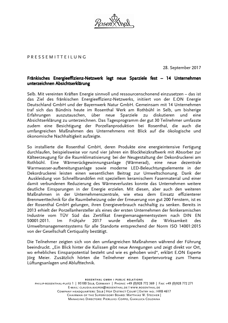 Selb. Mit vereinten Kräften Energie sinnvoll und ressourcenschonend einzusetzen – das ist das Ziel des fränkischen Energieeffizienz-Netzwerks, initiiert von der E.ON Energie Deutschland GmbH und der Bayernwerk Natur GmbH. Gemeinsam mit 14 Unternehmen traf sich das Bündnis heute im Rosenthal Werk am Rothbühl in Selb, um bisherige Erfahrungen auszutauschen, über neue Sparziele zu diskutieren und eine Absichtserklärung zu unterzeichnen. In Zukunft soll der Energieverbrauch im Netzwerk um fünf Prozent gesenkt werden. Die CO2-Einsparung pro Jahr soll im Vergleich zum Start der Initiative bei sechs Prozent liegen. Bis 2019 wollen die Teilnehmer abgestimmte Maßnahmen zur Zielerreichung umsetzen, so dass künftig auf das Netzwerk bezogen pro Jahr 2.600 Tonnen CO2 gespart werden. Bei erfolgreicher Umsetzung sinken die Energiekosten in Summe aller Netzwerkpartner jährlich um insgesamt rund 900.000 Euro. Mit der eingesparten Energiemenge von elf Millionen Kilowattstunden könnten rechnerisch etwa 3000 Vier-Personen-Haushalte ihren Strombedarf ein Jahr lang decken.