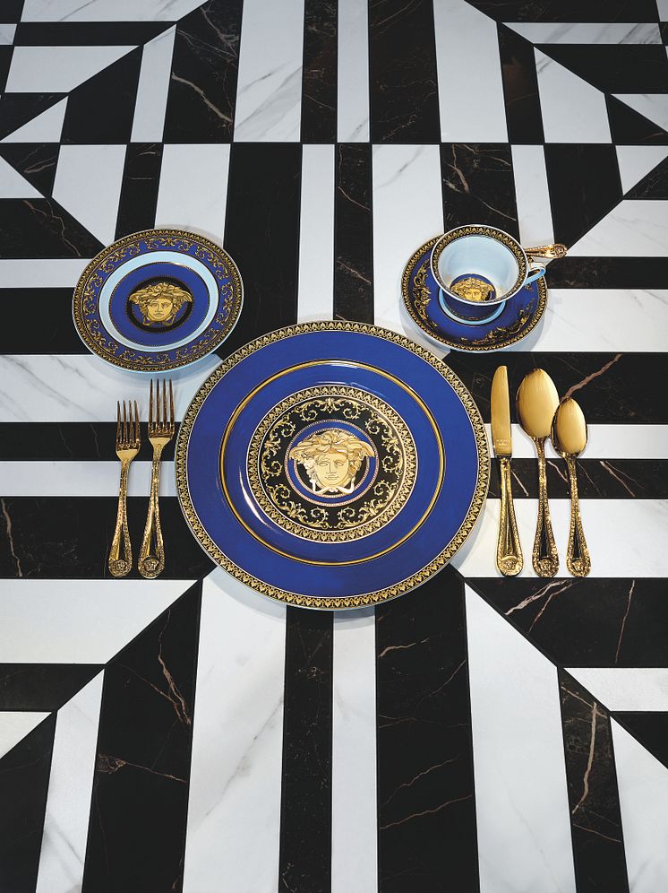 Mit Medusa Blue präsentiert Rosenthal die Kollektion in einer symbolischen Farbwelt. Königliches Blau, der Originalfarbton aus der Versace Home Collection versetzt die Service-Kollektion in eine vornehme Farbstimmung: edel und extravagant. Neben der satten blauen Grundfarbe bleiben die bekannten Elemente bestehen: warme Gelbtöne in unterschiedlichen Nuancen, aufgehellt durch hochwertige Goldakzente und als Kontrapunkt vornehmes Schwarz.