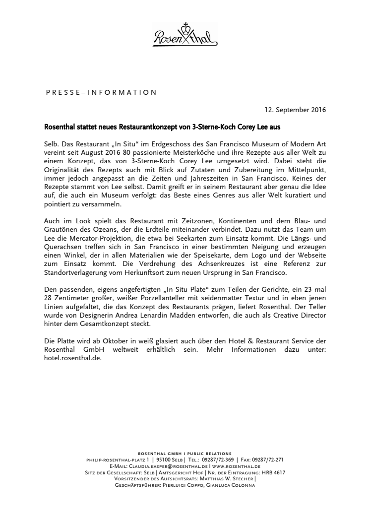 Den passenden, eigens angefertigten „In Situ Plate“ zum Teilen der Gerichte, ein 23 mal 28 Zentimeter großer, weißer Porzellanteller mit seidenmatter Textur und in eben jenen Linien aufgefaltet, die das Konzept des Restaurants prägen, liefert Rosenthal. Der Teller wurde von Designerin Andrea Lenardin Madden entworfen, die auch als Creative Director hinter dem Gesamtkonzept steckt.