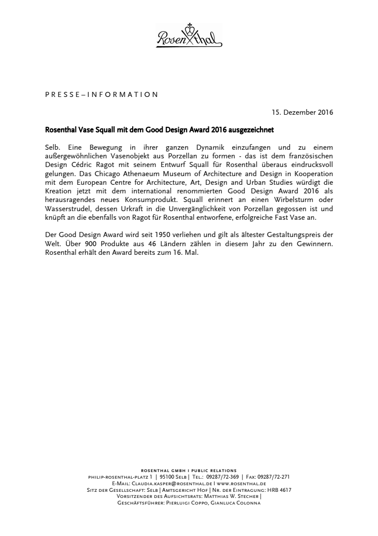 Der Good Design Award wird seit 1950 verliehen und gilt als ältester Gestaltungspreis der Welt. Über 900 Produkte aus 46 Ländern zählen in diesem Jahr zu den Gewinnern. Rosenthal erhält den Award bereits zum 16. Mal.