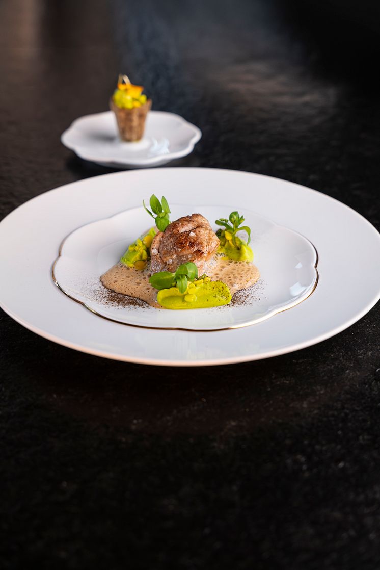 Auf seinem Lieblingsartikel der Kollektion, einem goldverzierten Präsentierteller aus Porzellan mit erhöhtem Spiegel in Blütenform, serviert er am liebsten Kalbsbries mit Holzkohleschaum und frischen gegrillten Erbsen – nicht zuletzt für das Farbspiel auf dem Teller.