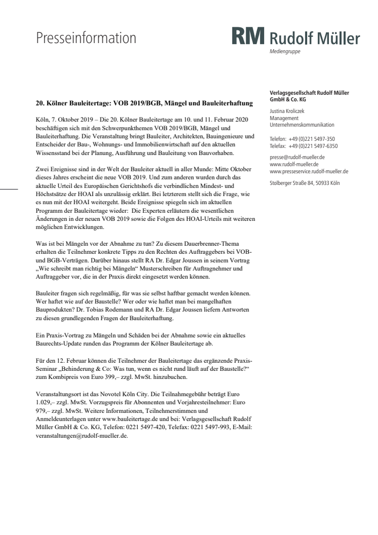 Die 20. Kölner Bauleitertage am 10. und 11. Februar 2020 beschäftigen sich mit den Schwerpunkthemen VOB 2019/BGB, Mängel und Bauleiterhaftung. Die Veranstaltung bringt Bauleiter, Architekten, Bauingenieure und Entscheider der Bau-, Wohnungs- und Immobilienwirtschaft auf den aktuellen Wissensstand bei der Planung, Ausführung und Bauleitung von Bauvorhaben.