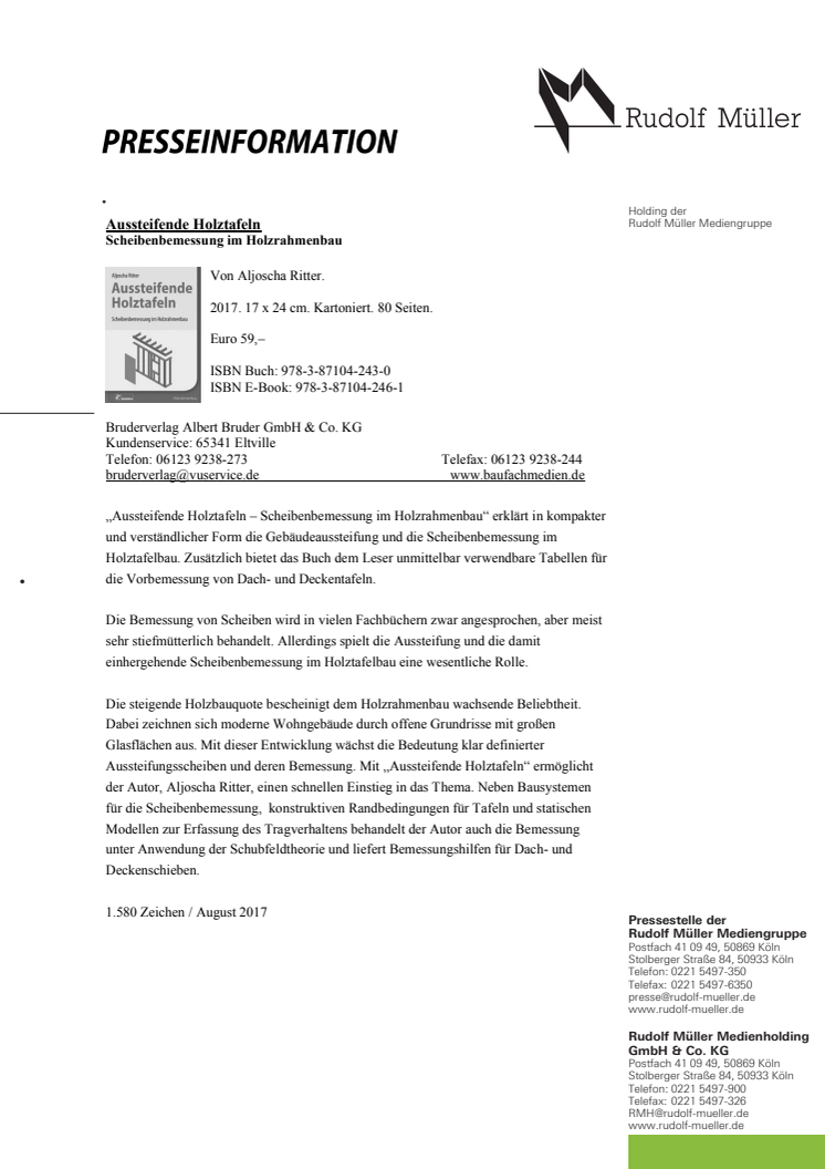 „Aussteifende Holztafeln – Scheibenbemessung im Holzrahmenbau“ erklärt in kompakter und verständlicher Form die Gebäudeaussteifung und die Scheibenbemessung im Holztafelbau. Zusätzlich bietet das Buch dem Leser unmittelbar verwendbare Tabellen für die Vorbemessung von Dach- und Deckentafeln.