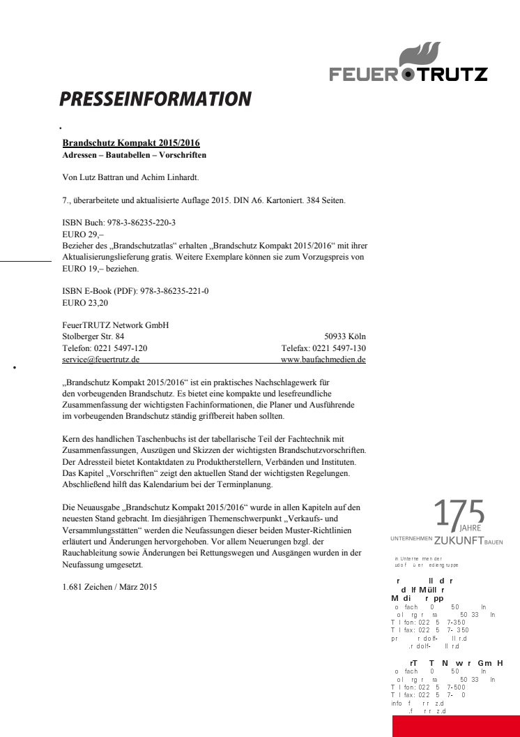 „Brandschutz Kompakt 2015/2016“ ist ein Nachschlagewerk für den vorbeugenden Brandschutz. Es bietet eine kompakte Zusammenfassung der wichtigsten Fachinformationen, die Planer und Ausführende im vorbeugenden Brandschutz ständig griffbereit haben sollten. Der diesjährige Themenschwerpunkt „Verkaufs- und Versammlungsstätten“ erläutert die Neufassungen der beiden Muster-Richtlinien.