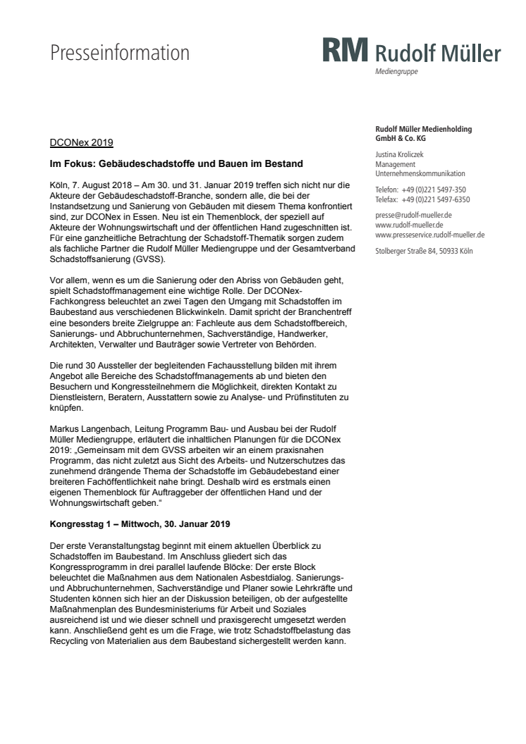 Am 30. und 31. Januar 2019 treffen sich nicht nur die Akteure der Gebäudeschadstoff-Branche, sondern alle, die bei der Instandsetzung und Sanierung von Gebäuden mit diesem Thema konfrontiert sind, zur DCONex in Essen. Für eine ganzheitliche Betrachtung der Schadstoff-Thematik sorgen als fachliche Partner die Rudolf Müller Mediengruppe und der Gesamtverband Schadstoffsanierung (GVSS).