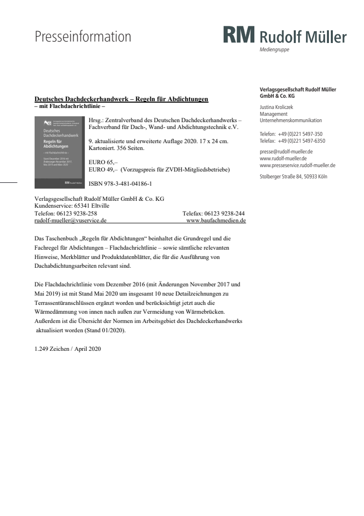 Das Taschenbuch „Regeln für Abdichtungen“ beinhaltet die Grundregel und die Fachregel für Abdichtungen – Flachdachrichtlinie – sowie sämtliche relevanten Hinweise, Merkblätter und Produktdatenblätter, die für die Ausführung von Dachabdichtungsarbeiten relevant sind.