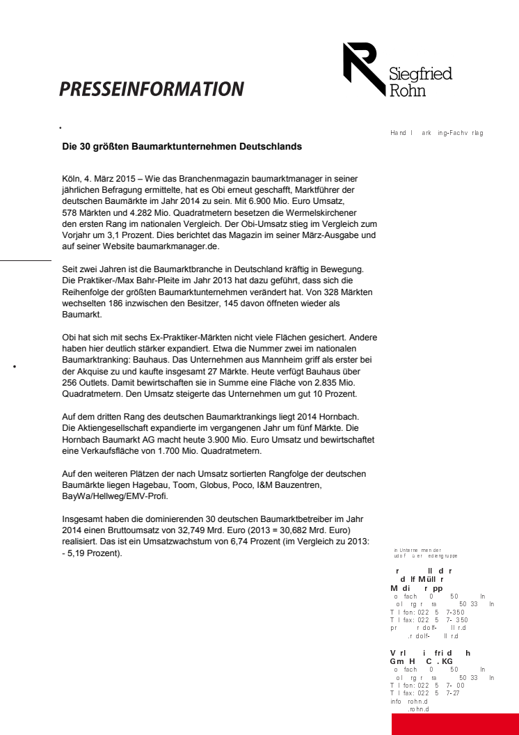 Wie das Branchenmagazin baumarktmanager in seiner jährlichen Befragung ermittelte, hat es Obi erneut geschafft, Marktführer der deutschen Baumärkte im Jahr 2014 zu sein. Mit 6.900 Mio. Euro Umsatz, 578 Märkten und 4.282 Mio. Quadratmetern besetzen die Wermelskirchener den ersten Rang im nationalen Vergleich. Der Obi-Umsatz stieg im Vergleich zum Vorjahr um 3,1 Prozent.