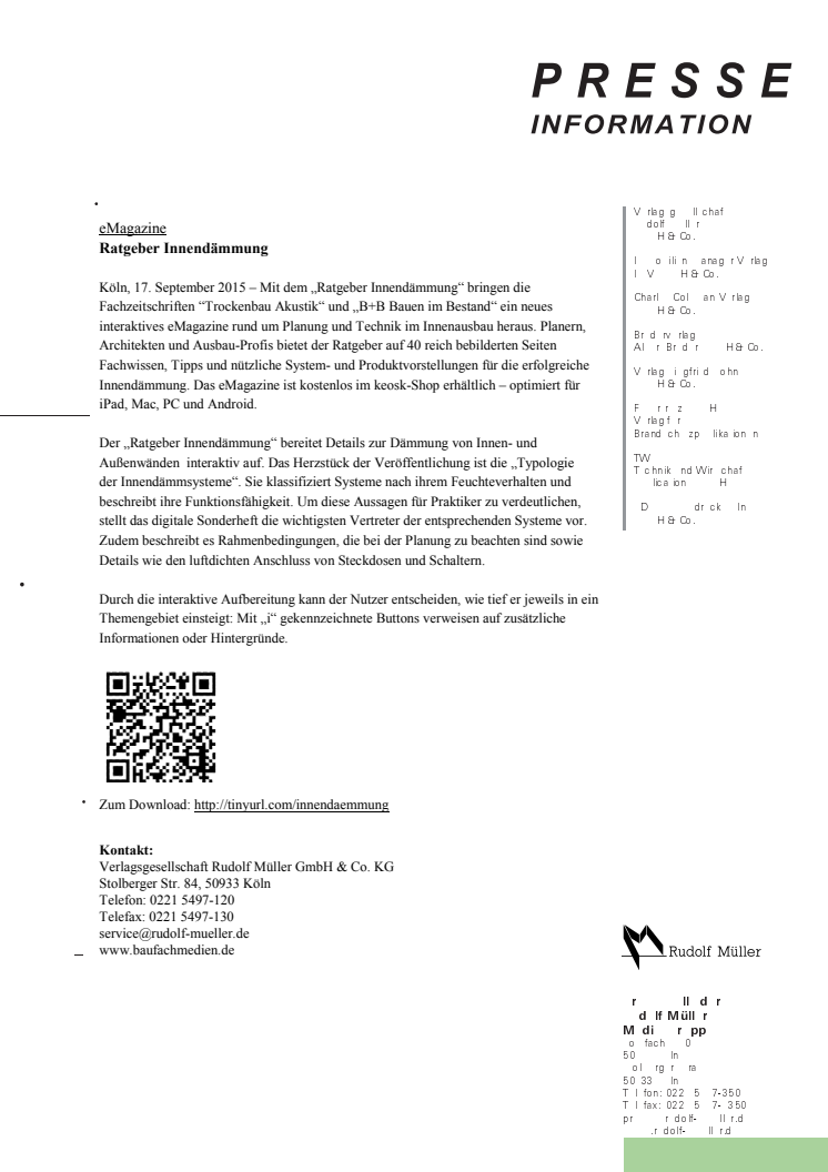 Der „Ratgeber Innendämmung“ bietet Tipps und nützliche System- und Produktvorstellungen. Kurzum, gebündeltes und bebildertes Fachwissen für erfolgreiche Planer und Verarbeiter im Innenausbau. Das eMagazine wurde von den Fachzeitschriften B+B BAUEN IM BESTAND und Trockenbau Akustik herausgegeben und ist jetzt im keosk-Shop kostenlos erhältlich – jeweils optimiert für iPad, Mac, PC oder Android.