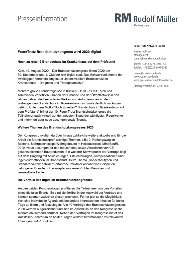 Der Brandschutzkongress findet 2020 am 30. September und 1. Oktober rein digital statt. Das Schwerpunktthema der zweitägigen Veranstaltung lautet „Intensivpatient Brandschutz im Krankenhaus – Diagnose und Therapieansätze“.