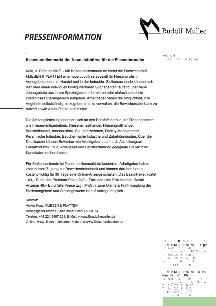Mit fliesen-stellenmarkt.de bietet die Fachzeitschrift FLIESEN & PLATTEN eine neue Jobbörse speziell für Fliesenprofis in Verlegebetrieben, im Handel und in der Industrie.