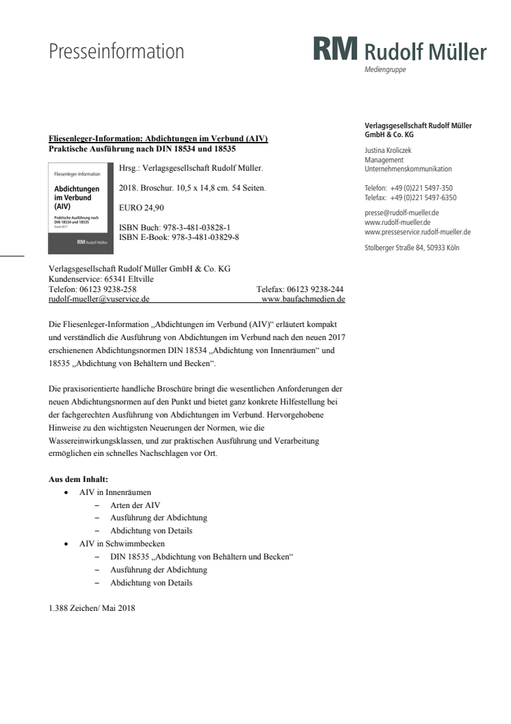Die Fliesenleger-Information „Abdichtungen im Verbund (AIV)“ erläutert kompakt und verständlich die Ausführung von Abdichtungen im Verbund nach den neuen 2017 erschienenen Abdichtungsnormen DIN 18534 „Abdichtung von Innenräumen“ und 18535 „Abdichtung von Behältern und Becken“.