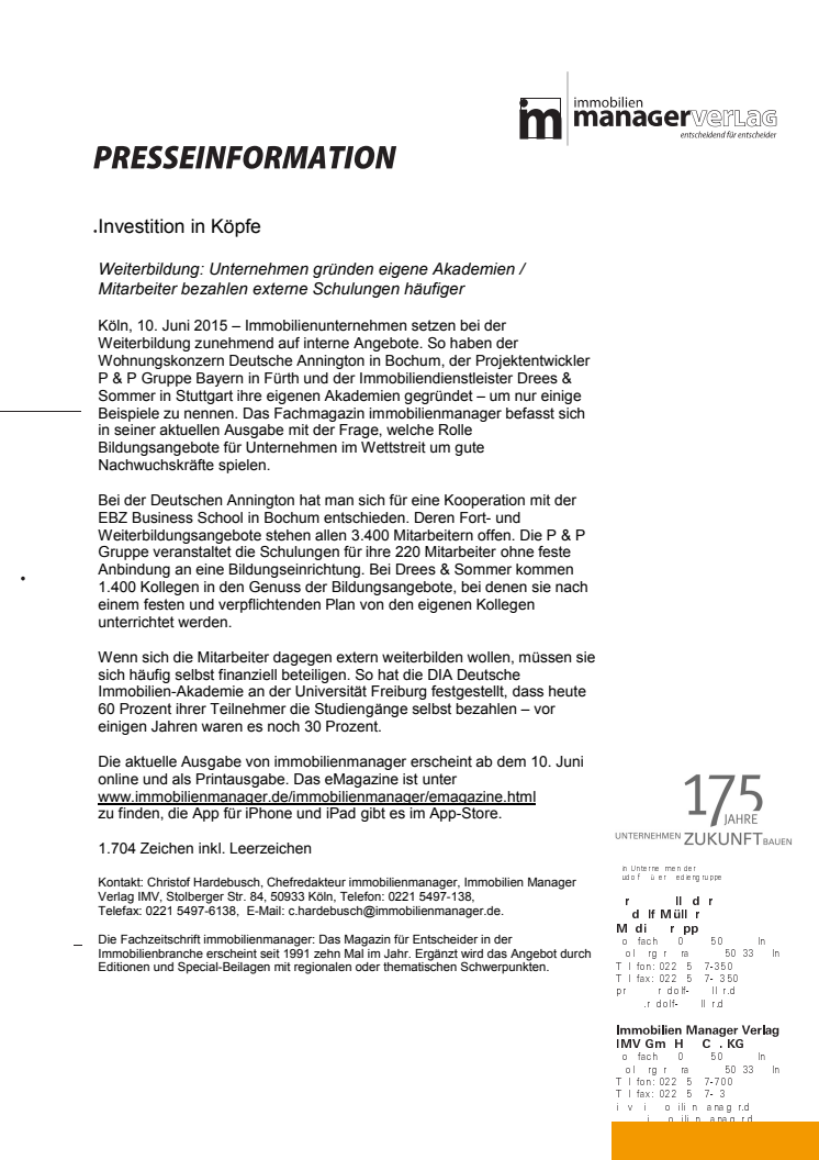 Das Fachmagazin immobilienmanager befasst sich in seiner aktuellen Juni-Ausgabe mit der Frage, welche Rolle Bildungsangebote für Unternehmen im Wettstreit um gute Nachwuchskräfte spielen.