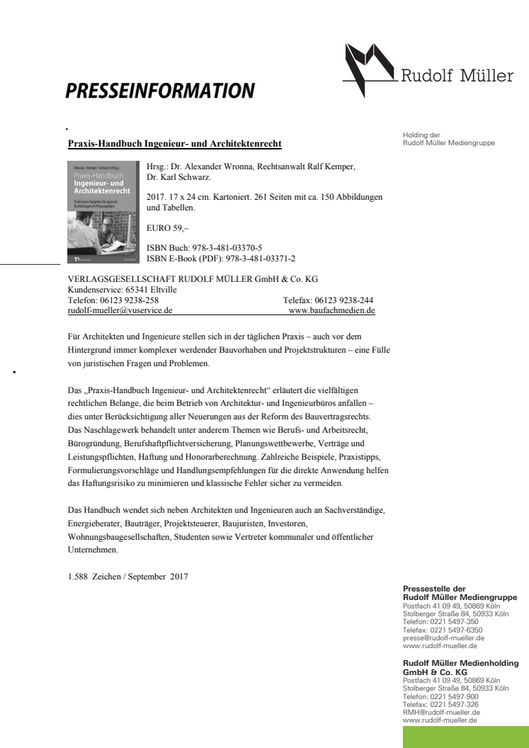 Für Architekten und Ingenieure stellen sich in der täglichen Praxis eine Fülle von juristischen Fragen und Problemen. Das „Praxis-Handbuch Ingenieur- und Architektenrecht“ erläutert die vielfältigen rechtlichen Belange, die beim Betrieb von Architektur- und Ingenieurbüros anfallen.