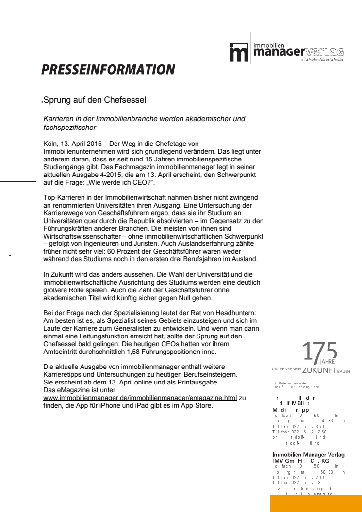 Der Weg in die Chefetage von Immobilienunternehmen wird sich grundlegend verändern. Das liegt unter anderem daran, dass es seit rund 15 Jahren immobilienspezifische Studiengänge gibt. Das Fachmagazin immobilienmanager legt in seiner aktuellen Ausgabe 4-2015, die am 13. April erscheint, den Schwerpunkt auf die Frage: „Wie werde ich CEO?“.