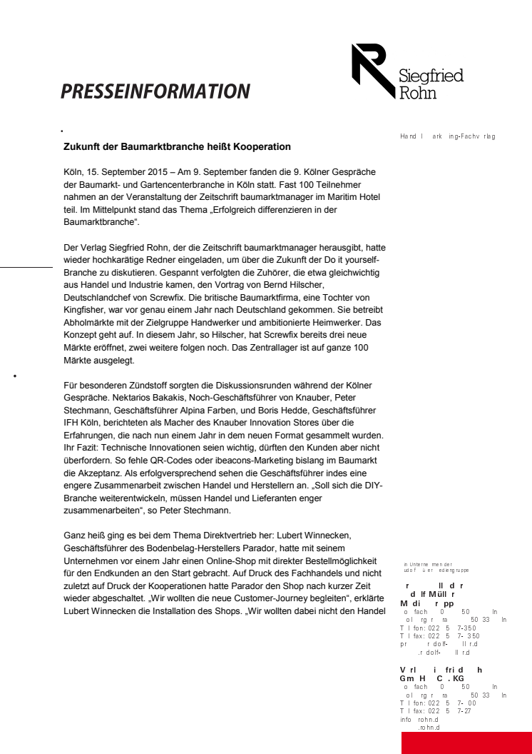 Am 9. September fanden die 9. Kölner Gespräche der Baumarkt- und Gartencenterbranche in Köln statt. Fast 100 Teilnehmer nahmen an der Veranstaltung der Zeitschrift baumarktmanager im Maritim Hotel teil. Im Mittelpunkt stand das Thema „Erfolgreich differenzieren in der Baumarktbranche“.