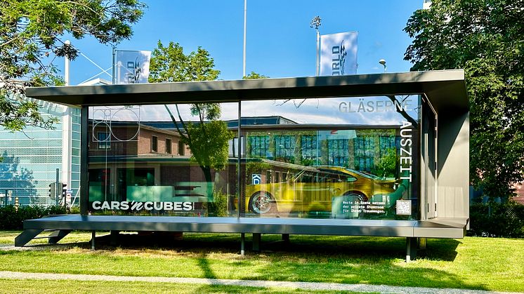 • Der Kubus wird als kompletter Raum im Betrieb in Ascha vorgefertigt und mit einem Kran auf jeder gewünschten Fläche aufgestellt – wie hier auf dem Gelände der Motorworld München