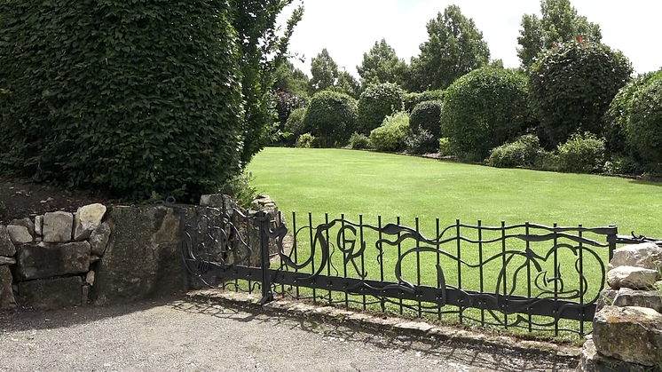 • Das Tor und die Pforten zum Weinberg haben die knorrigen Weinreben zum Vorbild, im Tor erkennbar ist ein schlafendes Mädchen – ein Wunsch des Auftraggebers