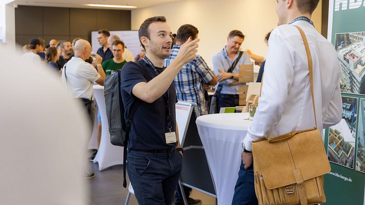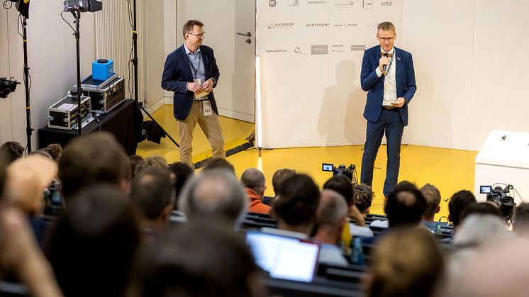 • Malte von Lüttichau (l.) von RM Rudolf Müller Medien GmbH und Prof. Alexander Stahr von der HTWK Leipzig begrüßten die 200 Gäste am Mittag des ersten Veranstaltungstages.