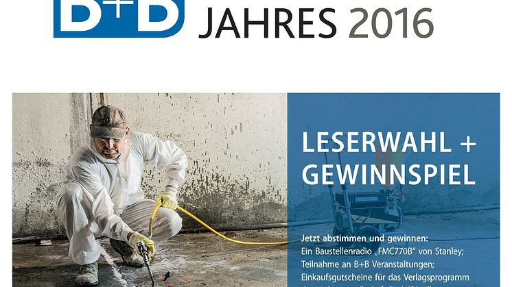 Das B+B PRODUKT DES JAHRES wird von den Lesern der Fachzeitschrift B+B BAUEN IM BESTAND sowie den Nutzern der dazugehörigen Online-Plattform www.BauenimBestand24.de gewählt. 728 Leser haben sich von Mitte Oktober bis Mitte Dezember 2015 an der Abstimmung beteiligt und so in den vier Kategorien die Sieger gekürt.