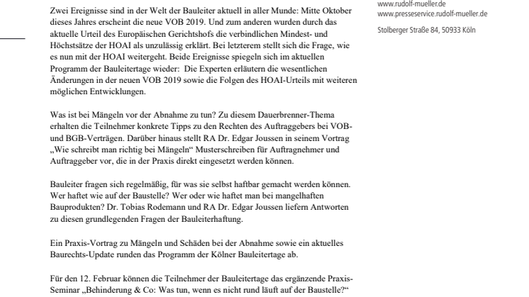 Köln, 7. Oktober 2019 – Die 20. Kölner Bauleitertage am 10. und 11. Februar 2020 beschäftigen sich mit den Schwerpunkthemen VOB 2019/BGB, Mängel und Bauleiterhaftung. Die Veranstaltung bringt Bauleiter, Architekten, Bauingenieure und Entscheider der Bau-, Wohnungs- und Immobilienwirtschaft auf den aktuellen Wissensstand bei der Planung, Ausführung und Bauleitung von Bauvorhaben.
