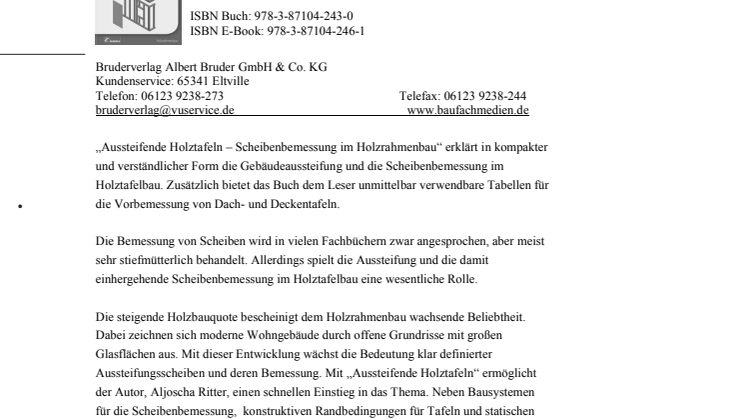 „Aussteifende Holztafeln – Scheibenbemessung im Holzrahmenbau“ erklärt in kompakter und verständlicher Form die Gebäudeaussteifung und die Scheibenbemessung im Holztafelbau. Zusätzlich bietet das Buch dem Leser unmittelbar verwendbare Tabellen für die Vorbemessung von Dach- und Deckentafeln.